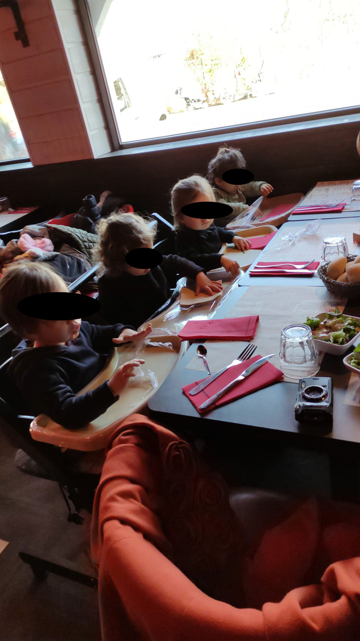Isia commande elle-même. Elle choisit, elle dit au serveur ce qu’elle veut, elle dit merci. C’est un moment de fierté immense pour une enfant de 6 ans — être traitée comme une grande, avoir son mot à dire, être entendue par un adulte inconnu. Alma essaie de faire pareil, en pointant le doigt sur l’image du menu « frites » avec un grand sourire. Ces petits actes d’autonomie en public renforcent la confiance en soi d’une façon que le quotidien à la maison ne permet pas toujours.
